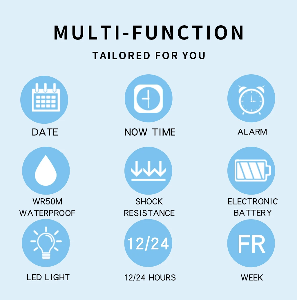 Special functions: week display, month display, Luminous, whole point reminder, alarm, waterproof, shockproof, 12/24 hours